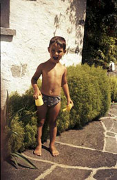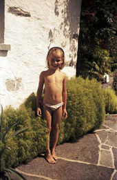 das rechte Bein des Jungen, das teilweise vom Gebüsch